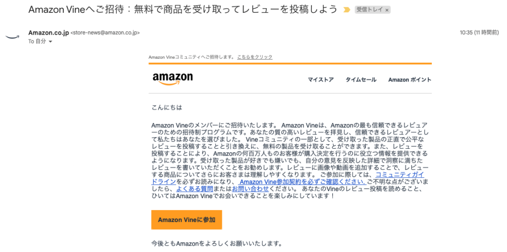 【レビュー】Amazon Vineへご招待されました!! 【レビュー】 Twitter Facebook はてブ Pocket LINE コピー 2022.08.19 Amazon Vineへご招待のメールが届きました。2022.08.19(↓画像) レビューの書き込み数は41件です。(↓画像)たいして多くない気がしますが…。 参加したらこんな画面が表示されました。↓